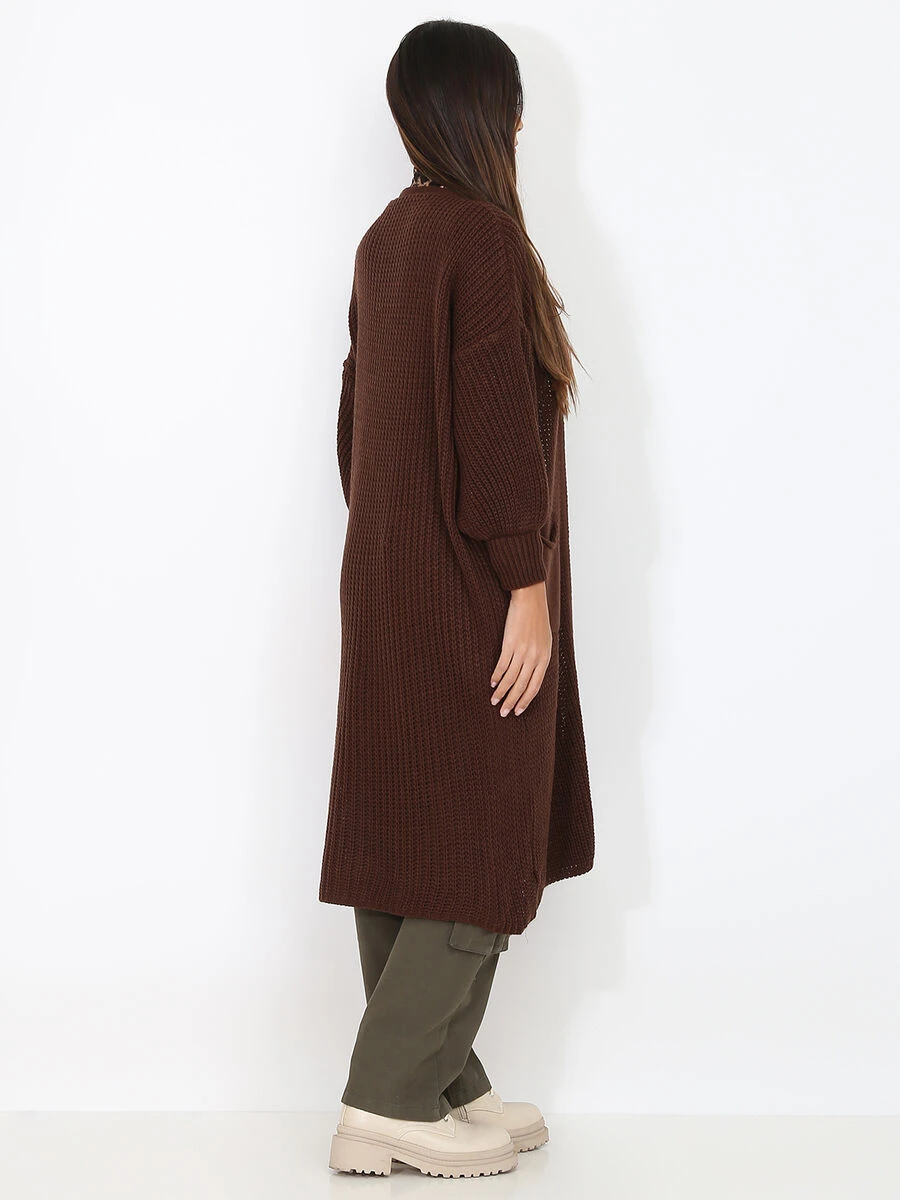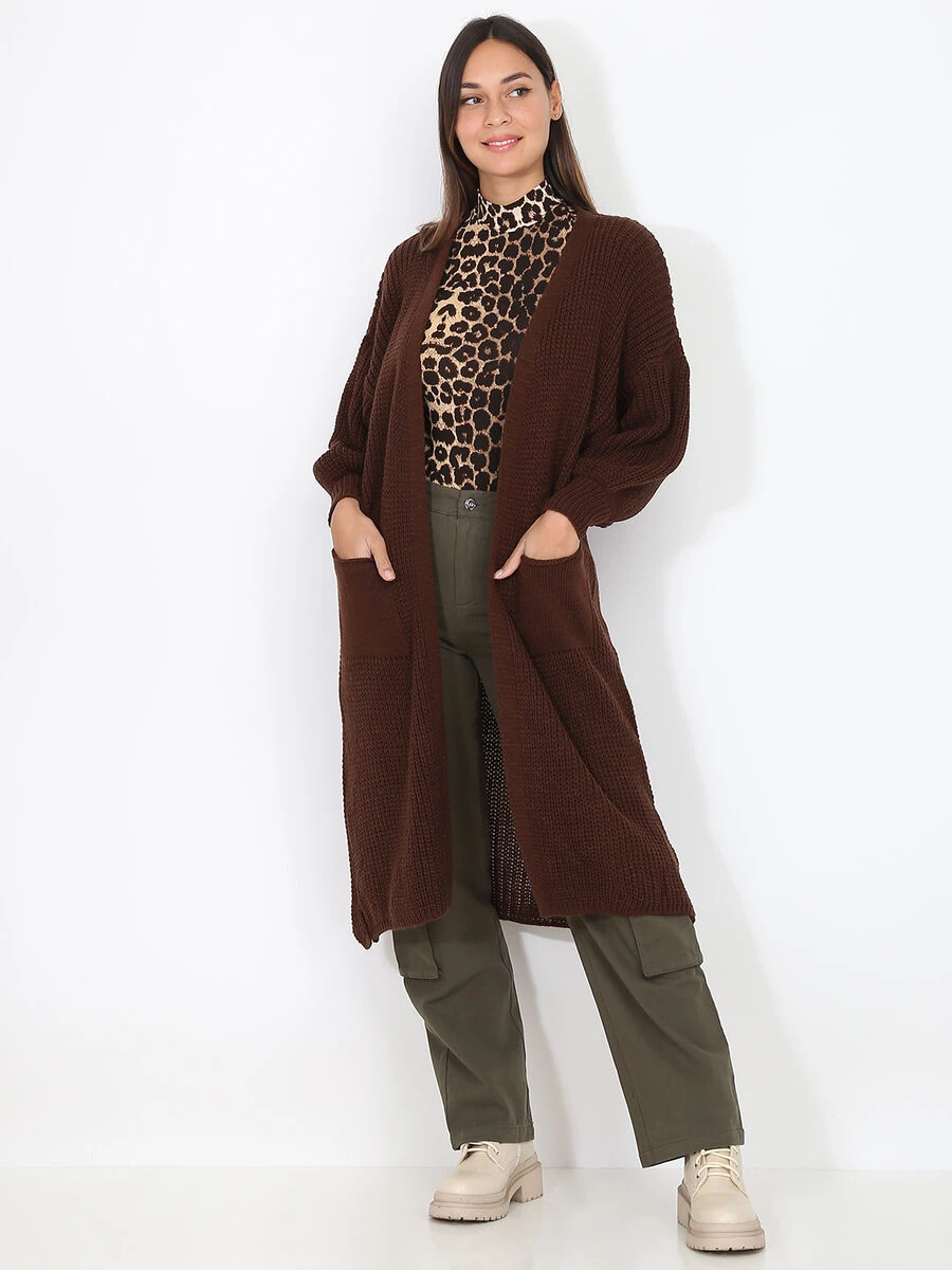 Gilet long en maille ajourée à manches ballon avec 2 poches.