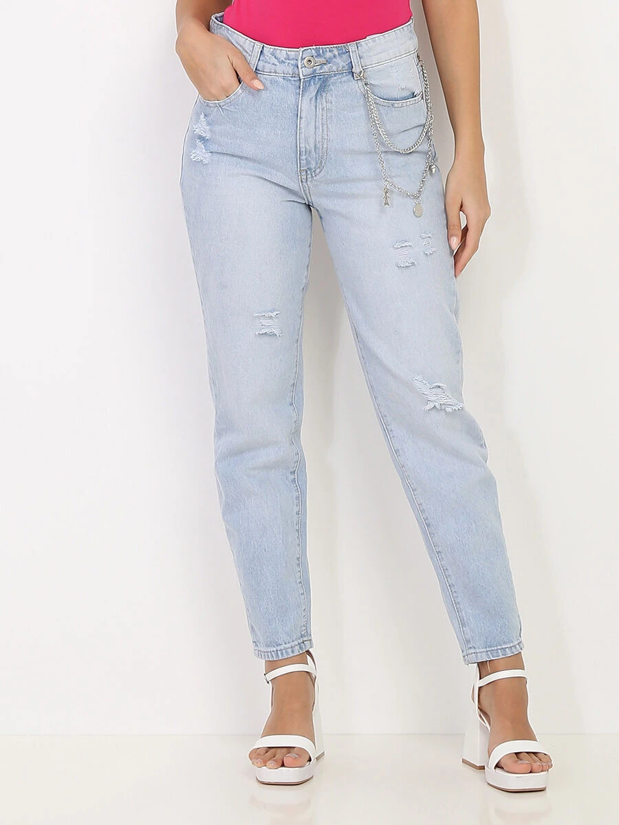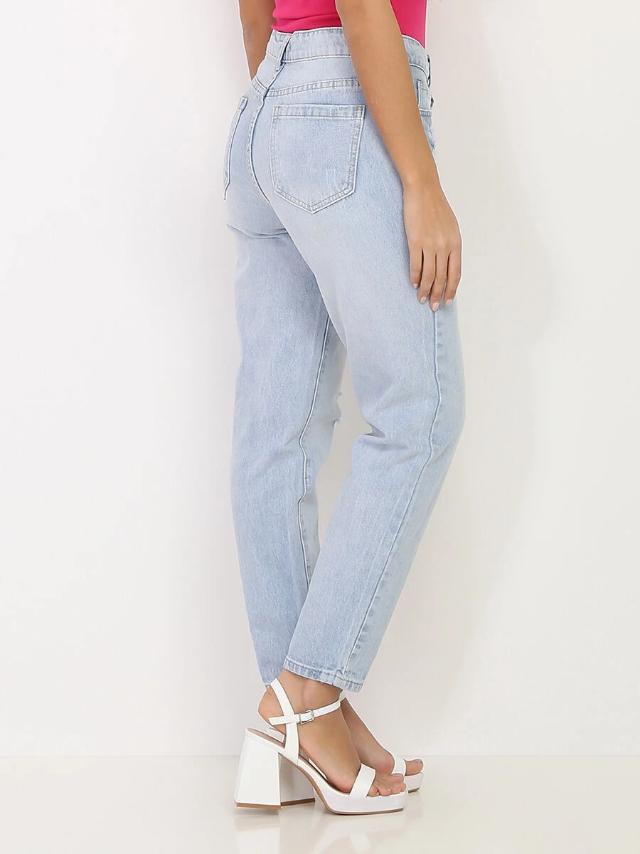 Jeans style mom légèrement délavé bleu clair à taille haute.