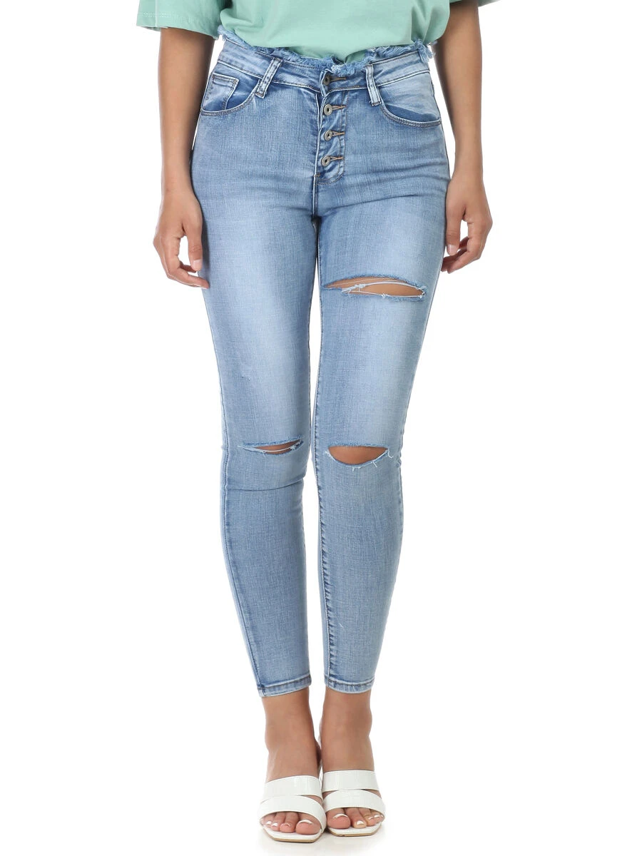 Jeans skinny légèrement délavé troué sur le devant.