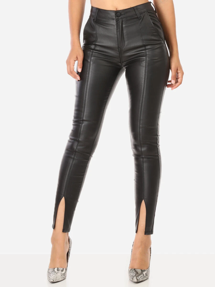 Pantalon skinny noir enduit avec surpiqûres à l’avant.